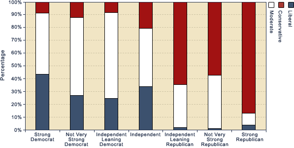 Distribution of Ideology Among Party Identifiers in Texans (July 2008)