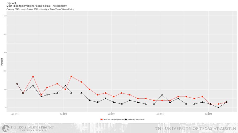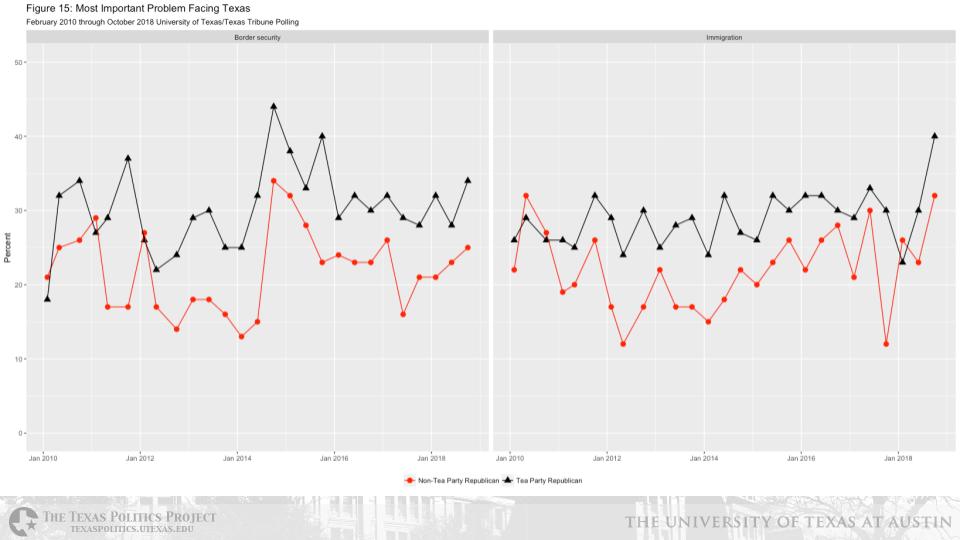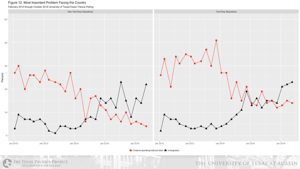 But the roots of the coarse nativism and race-baiting commonly associated withTrump were already well established in the attitudes of Texas Republicans by the time he mounted his run, particularly if we go back to the dawn of the tea party movement’s emergence as a force in Republican politics. Public opinion data clearly show that after a brief preoccupation with issues such as federal spending and taxes, the adherents of the tea party insurgency that surged in 2009 within a few years time became more focused on illegal immigration and the security of the border as their primary national concern.