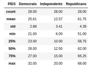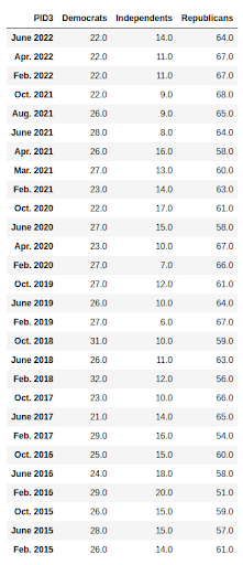 Summary statistics for party identification among rural respondents in Texas Politics Project polls, February 2015- June 2022.