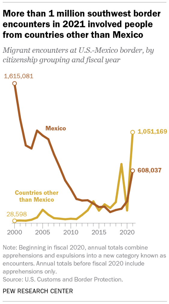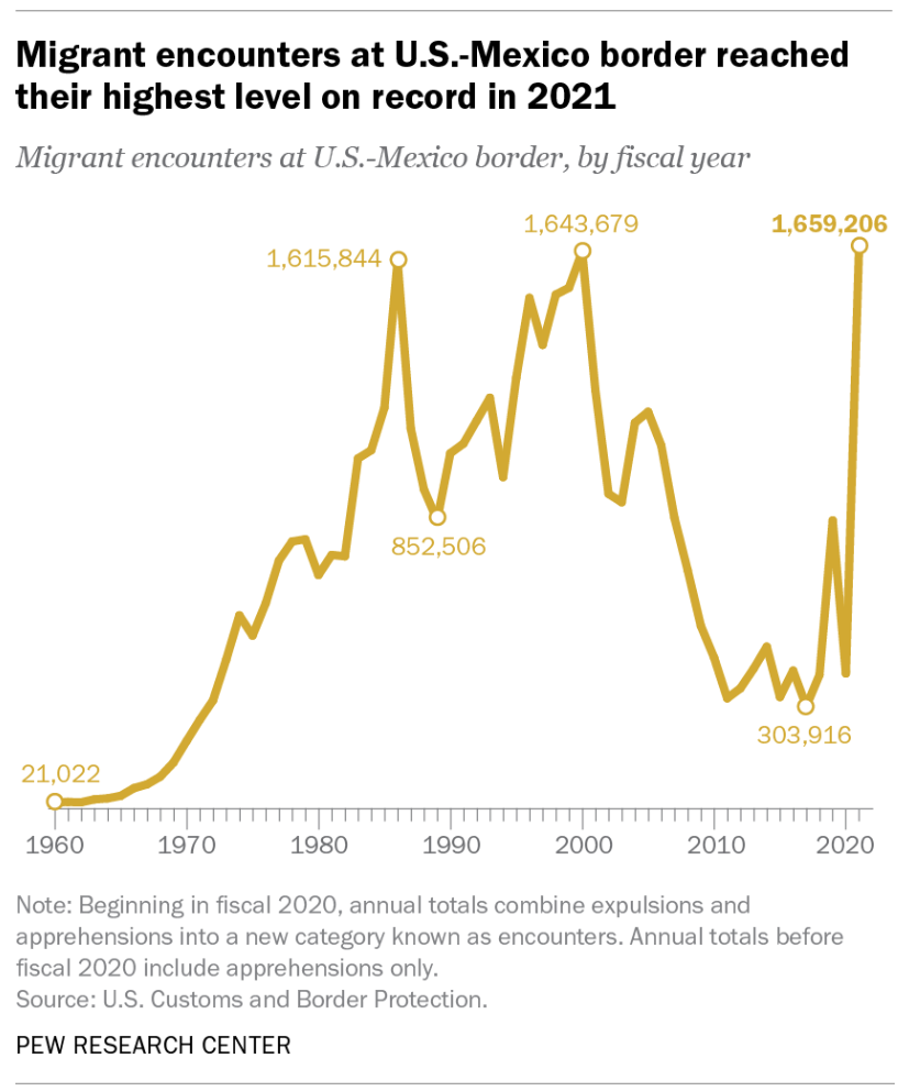 While the foreign nationals who enter the U.S. do so in a variety of ways and under a variety of circumstances (like on airplanes through airports with visas), the political discussion around immigration centers on illegal immigration (which is often conflated with both legal immigration and flows of refugees). So we start with the ur-issue of border security: undocumented immigration.